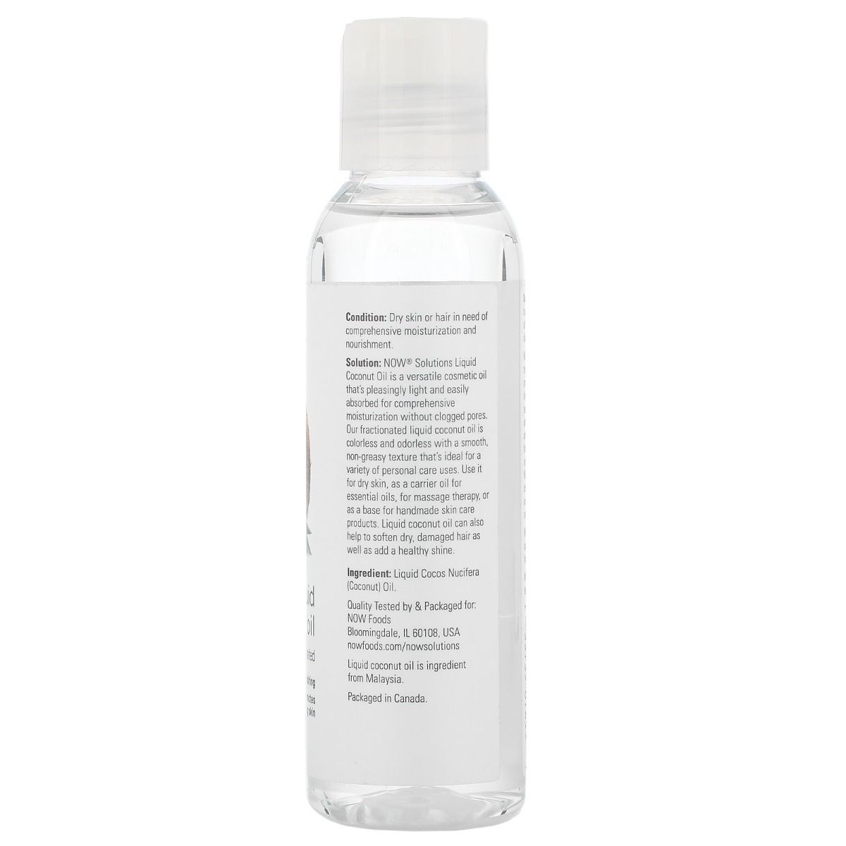 Flüssiges Kokosöl. Klare Flasche indeholder UV-Lichtschutzmittel. |