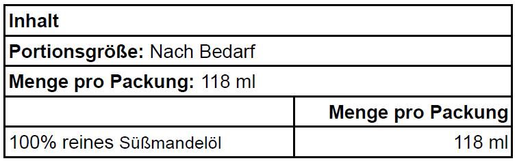 | Inhalt | NOW FOODS 100% REINES SÜSSMANDELÖL, 118 ML |