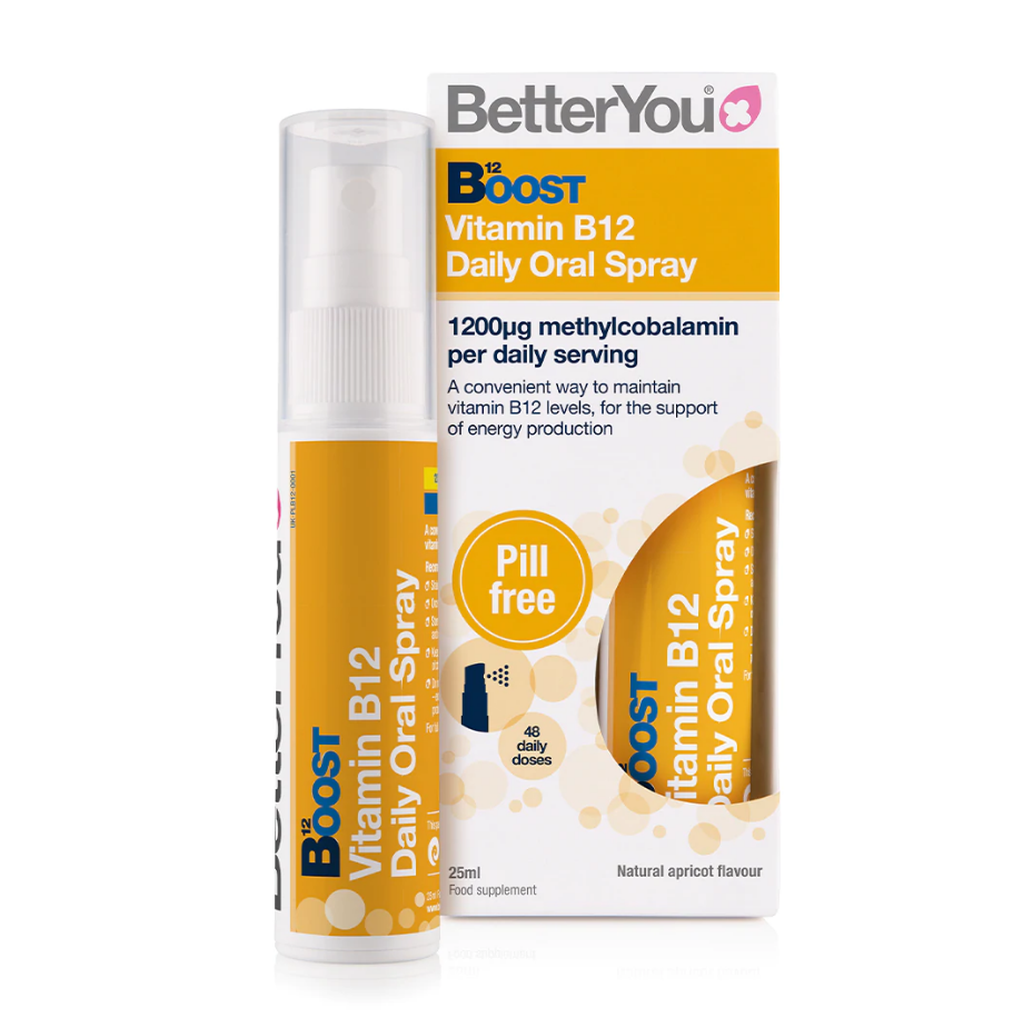 - BetterYou Boost B12 Oral Spray ist ein starkes B12-Präparat, das zur Unterstützung der normalen psychischen Funktion formuliert und fachmännisch gemischt wurde, um das Energieniveau zu steigern.