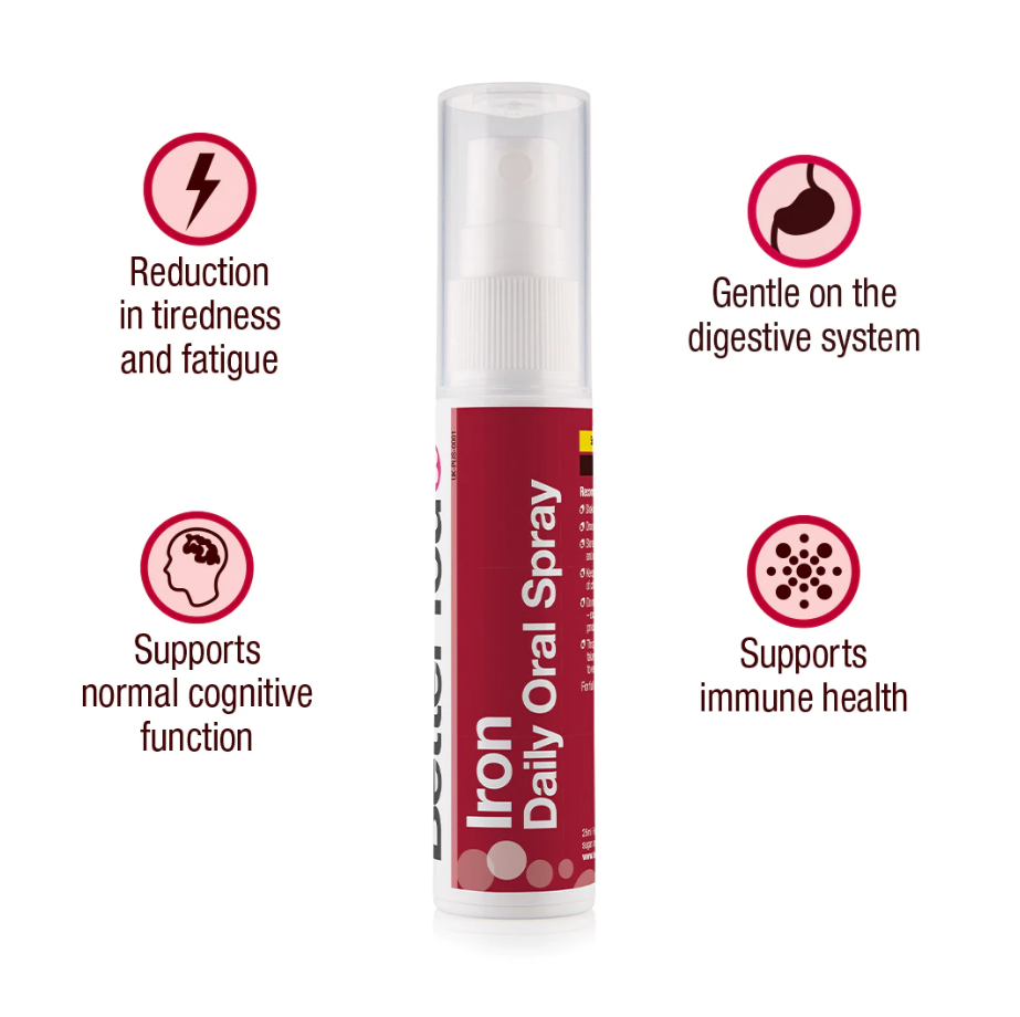 Das Iron Oral Spray liefert 5 mg Eisen pro 4 Sprühstöße und wurde speziell entwickelt, um diesen lebenswichtigen Nährstoff direkt in den Mund zu bringen. Die winzigen Tröpfchen ziehen schnell ein und sorgen für eine schnelle Nährstoffaufnahme. Herkömmliche Wege der Eisenergänzung, einschließlich Tabletten, Kapseln und Flüssigkeiten, sind dafür bekannt, Verdauungsbeschwerden zu verursachen, da Eisen den Verdauungstrakt reizt. Infolgedessen kann es bei dieser Art der Nahrungsergänzung zu mehreren negativen Nebenwirkungen auf den Körper kommen, darunter Verstopfung, Übelkeit, Magenschmerzen, Blähungen und Sodbrennen. Eisen trägt zu einer normalen Funktion des Immunsystems bei, unterstützt eine normale kognitive Funktion und hilft bei der Verringerung von Müdigkeit und Erschöpfung. Jeder braucht Eisen, um gesund zu sein, aber es gibt Personengruppen, die besonders anfällig für Eisenmangel sind, da die Eisenwerte nicht optimal sind. Dazu gehören Menschen mit Malabsorptionsproblemen, Schwangere, Frauen mit starken Perioden, Sportler und Menschen, die sich vegetarisch oder vegan ernähren. Passend für :