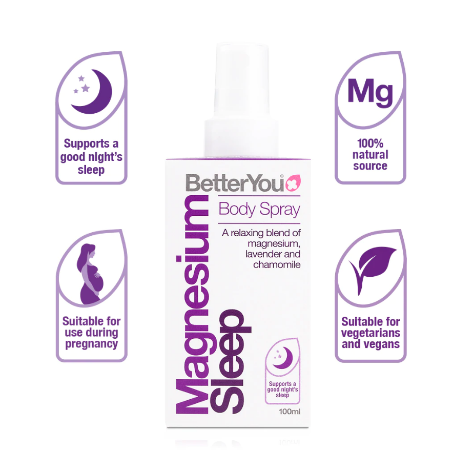- BetterYou Magnesium Sleep Body Spray kombiniert Zechstein-Magnesiumchlorid mit Lavendel und Kamille und fördert tiefe Entspannung, Wohlbefinden und natürlichen, ruhigen Schlaf.