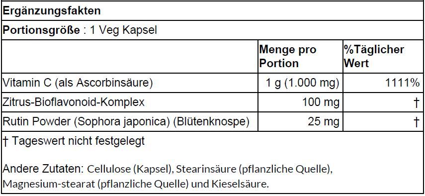 | Vitamin C (als Ascorbinsäure) | 1 g (1.000 mg) | 1111% |