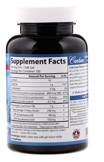Carlson Labs Cod Liver Oil Gems norwegischer Lebertran 1000 mg 100 Weichkapseln