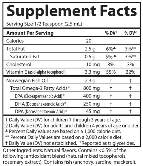 | Verwendung | Kinder ab 2 Jahren: 1/2 Teelöffel einmal oder zweimal am Tag verabreichen. Fragen Sie Ihren Kinderarzt, bevor Sie es Kindern unter 2 Jahren verabreichen. Nach dem ersten Öffnen der Flasche im Kühlschrank aufbewahren und innerhalb von 100 Tagen verwenden. |