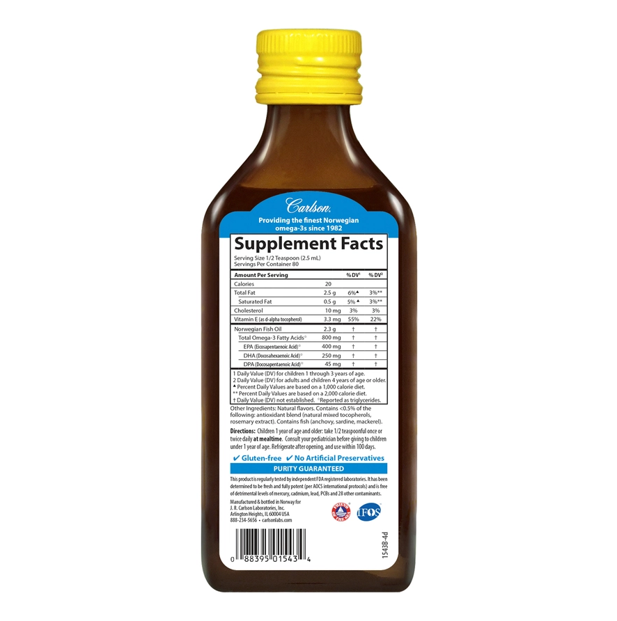 CARLSON LABS FOR KIDS NORWEGISCHES FISCHÖL, NATÜRLICHES ZITRONENGESCHMACK 200ML