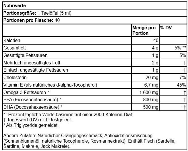 | Inhalt | Natürlicher Orangengeschmack, Antioxidationsmischung (Sonnenblumenöl, natürliche Tocopherole, Rosmarinextrakt). Enthält Fisch (Sardelle, Sardine, Makrele, Jack Makrele). |