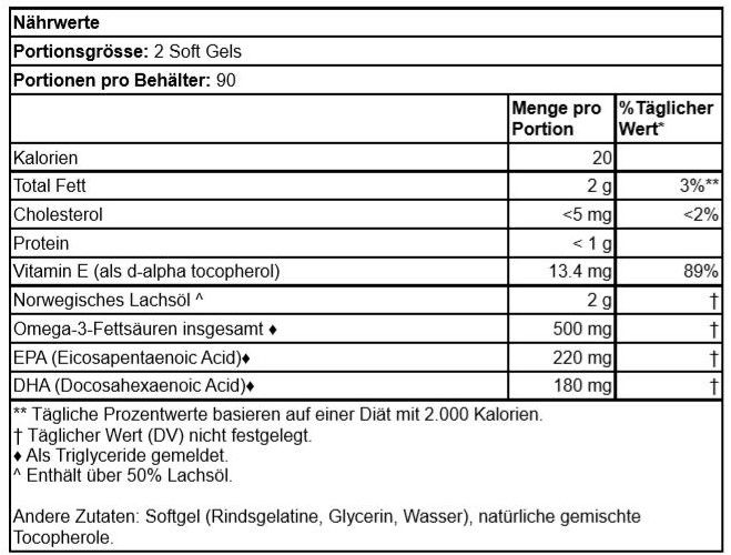 | Beschreibung | Lachs ist einer der besten Fische, die wir durch unsere Ernährung bekommen können. Die meisten von uns essen jedoch nicht genug Lachs wöchentlich, um die empfohlene Menge an Omega-3-Fettsäuren zu erhalten, weshalb eine Ergänzung eine gute Option sein kann. Jede Portion Lachsöl enthält 500 mg Omega-3-Fettsäuren, einschließlich EPA und DHA, die die Gesundheit von Herz, Gehirn, Sehkraft und Gelenken unterstützen. |