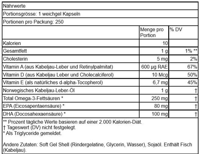 | Inhalt | Softgel Kaps (Rindergelatine, Glycerin, Wasser), Sojaöl. Enthält Fisch (Kabeljau). |