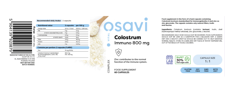 If you are experiencing recurrent infections and are looking for a natural way to improve your condition, it may be worth considering supplementing with colostrum[1]. Colostrum, also known as first milk or beestings, is a fluid secreted by the mammary glands of mammals just before and after giving birth. It is the first protection against diseases that a newborn receives, as it contains components that stimulate and strengthen the immune system [1]. Supplementing with bovine colostrum, which contains antibodies such as immunoglobulin G, can significantly improve immune system function [2]. Colostrum has immunomodulatory properties, which means that it can help fight and protect against diseases and infections [1, 2]. Additionally, colostrum has antimicrobial effects [3], which can help reduce the risk of respiratory diseases [4, 5] and infections caused by E. coli[6]. Supplementing with colostrum can be particularly beneficial for physically active individuals. Studies have shown that it can help increase lean body mass and improve anaerobic power [7, 8]. Moreover, supplementing with colostrum can accelerate muscle recovery after physical exertion, which is important for performance during training [9]. Our colostrum bovinum supplement is standardised to contain at least 30% immunoglobulin G in its dry mass. Colostrum is obtained within 12 hours after calving from excess milk from Holstein-Friesian cows. The time of collection is significant, as collecting colostrum within 12 hours allows for a high percentage of immunoglobulin content. In the next stage, colostrum undergoes microfiltration and spray drying, which preserves the bioactivity of its components (immunoglobulins and peptides) while simultaneously removing harmful pathogens. The product is free of antibiotics and synthetic hormones. The recommended daily dose is 2 capsules, providing 1000 mg of colostrum, including 300 mg of immunoglobulin G. |