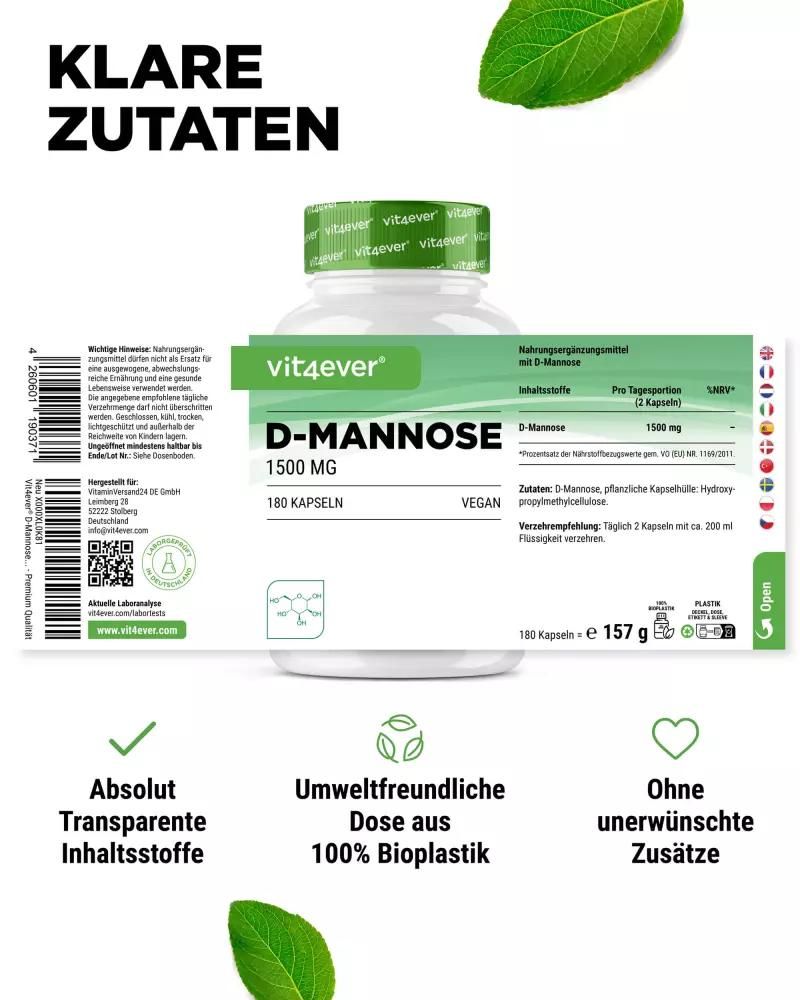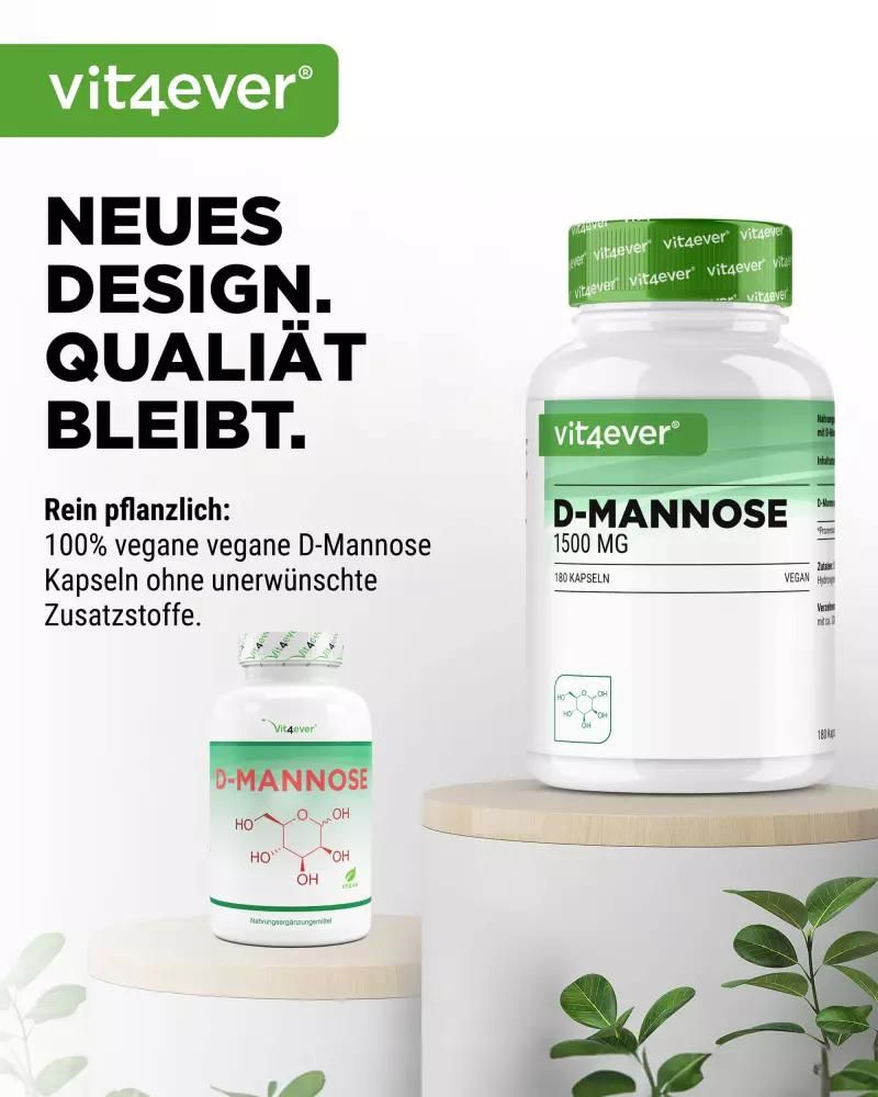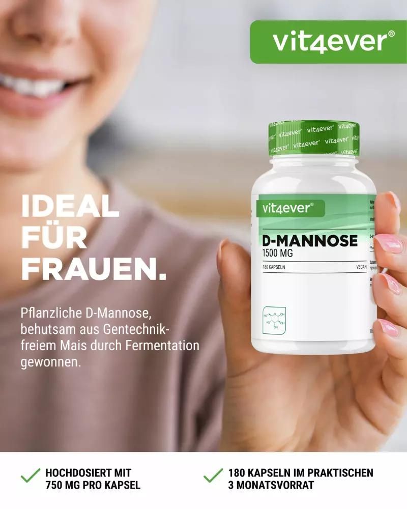 D-Mannose Kapseln: Natürlicher Einfachzucker für Ihre GesundheitD-Mannose, ein natürlich vorkommender Monosaccharid, ist mehr als nur ein Einfachzucker. Dieses weiße, süß schmeckende Pulver ist eng mit Glucose verwandt und findet sich in Früchten wie Pfirsichen, Äpfeln und Blaubeeren. Obwohl unser Körper nur geringe Mengen produziert, hat D-Mannose das Potenzial, Bakterien wie E.-coli zu erkennen und sich daran zu binden. Dies macht es zu einem wertvollen Bestandteil in der Nahrungsergänzung. Hochdosierte D-Mannose Kapseln von Vit4everMit 1500 mg D-Mannose pro Tagesdosis bieten die Vit4ever D-Mannose Kapseln eine kraftvolle Formel für den täglichen Bedarf. Jede Dose enthält 180 Kapseln, die aus gentechnikfreiem Mais hergestellt werden, was einen 3-monatigen Vorrat bei einer Einnahme von 2 Kapseln täglich garantiert. Vorteile der Vit4ever D-Mannose Kapseln