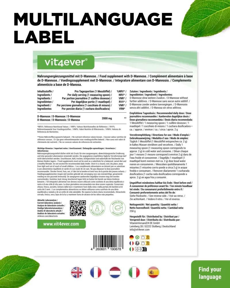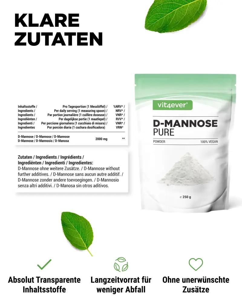 Vit4ever D-Mannose Pulver: Ihr täglicher Begleiter für ein gesundes WohlbefindenIn unserem hektischen Alltag kann es eine Herausforderung sein, auf unsere Gesundheit zu achten. Doch mit Vit4ever D-Mannose Pulver bieten wir Ihnen eine einfache und effektive Lösung, um Ihr Wohlbefinden täglich zu unterstützen. Dieses hochwertige Supplement versorgt Sie mit essentiellen Nährstoffen, die Ihr Körper braucht, um optimal zu funktionieren. Was ist D-Mannose?D-Mannose ist ein natürlich vorkommender Einfachzucker, der in vielen Früchten und Pflanzen zu finden ist und bekannt dafür ist, das Wohlbefinden der Harnwege zu unterstützen. Unsere Formulierung enthält eine optimale Dosis von 2000 mg pro Portion, um die Gesundheit auf natürliche Weise zu fördern. Vorteile von D-Mannose