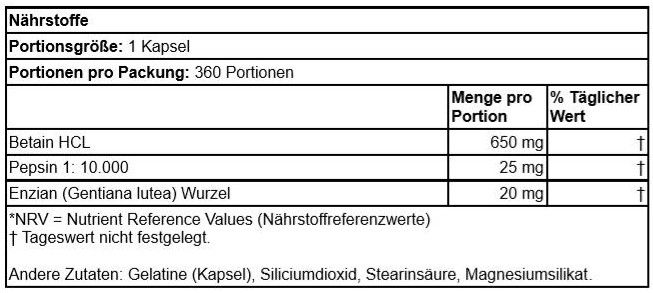 | Beschreibung | Betain HCL / Pepsin / Enzian Bittere enthält drei Ernährungsfaktoren, die einander komplimentieren und die designed worden sind die Effiktivität des Verdauungsprozesses zu unterstützen. Nahrungsergänzungen mit Betain HCL können die Verdauungsfähigkeit des Magens unterstützen. Pepsin ist ein Enzym, das vom Körper produziert wird, um proteinhaltige Nahrungsmittel im Magen zu verdauen. Pepsin wirkt in Verbindung mit Magensäure, um die Proteinverdauung zu unterstützen. Enzian ist ein Kraut, das verwendet wird, um die Verdauungskapazität zu stimulieren und den Verdauungstrakt zu optimieren. Seine bittere Natur kann dazu beitragen, die körpereigene Produktion von Verdauungsenzymen zu stimulieren. |