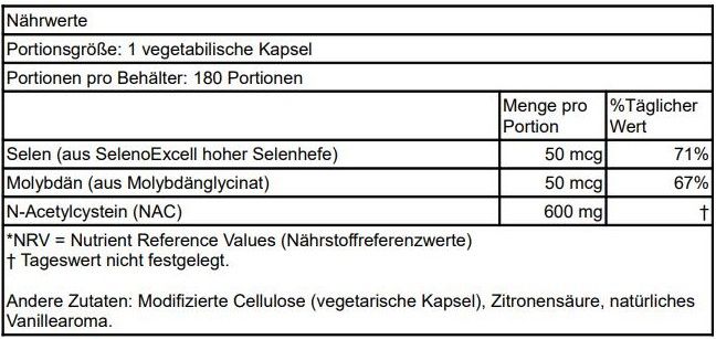 | Beschreibung | Doctor's Best NAC Detox-Regulatoren unterstützen die Produktion und Verwertung von Glutathion, dem wichtigsten schützenden und regulierenden Antioxidans, das natürlich konzentriert in gesunden Zellen vorkommt. NAC (N-Acetylcystein) ist dafür bekannt, die Glutathion-Produktion zu fördern. Selen und Molybdän sind wichtig dafür, die Rolle Glutathoins bei der Unterstützung der Energieproduktion, Entgiftung und anderer fundamentaler Lebensprozesse zu erleichtern. Fördert die Glutathion-Production in Gehirn, Leber und anderen Organen Unterstützt Enzyme, die natürliche und künstliche Giftstoffe neutralisieren Fördert eine gesunde Leberfunktion. |