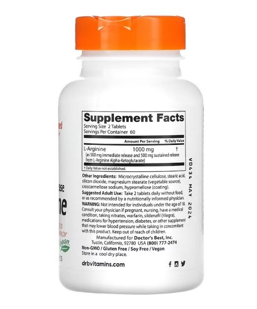 Doctor's Best L-Arginine - Sustained + Immediate Release, 500mg - 120 tablets