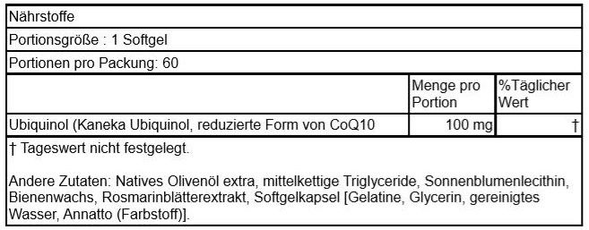 | Beschreibung | Doctor's Best Ubiquinol mit Kaneka Ubiquinol enthält die reduzierte Form von Coenzym Q10. Sowohl Ubiquinol (CoQ10-H2) als auch Ubichinon (CoQ10) sind metabolisch aktiv. Jede Form hat eine einzigartige Rolle in den Zellen in Bezug auf die antioxidative Wirkung, die Unterstützung einer gesunden Herzfunktion und die Steigerung der Energieproduktion. Ubiquinol hilft bei der Regeneration anderer Antioxidantien wie Vitamin C und E. Es bietet eine verbesserte Bioverfügbarkeit, insbesondere bei älteren Erwachsenen, die Schwierigkeiten haben, hohe Werte dieses Nährstoffs zu erreichen, oder bei solchen, die eine geringe Nährstoffaufnahme im Darm haben. |