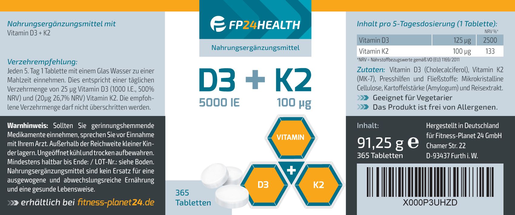 FP24 Health Vitamin D3+K2 - Vitamin D3 5000IE - Vitamin K2 100μg - 365 Tabletten