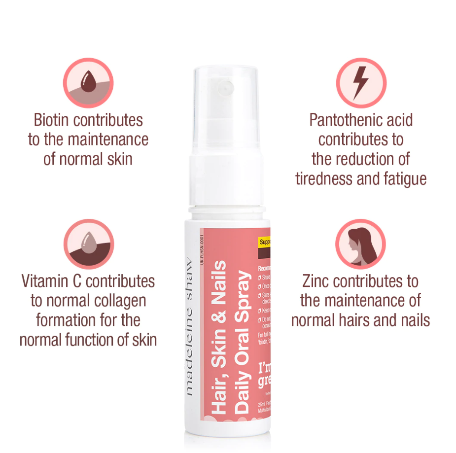 - Hair, Skin & Nails Oral Spray ist eine fachmännische Mischung aus sechs schönheitsfördernden Nährstoffen, darunter Vitamin C, Biotin, Pantothensäure, Zink, Selen und Jod.