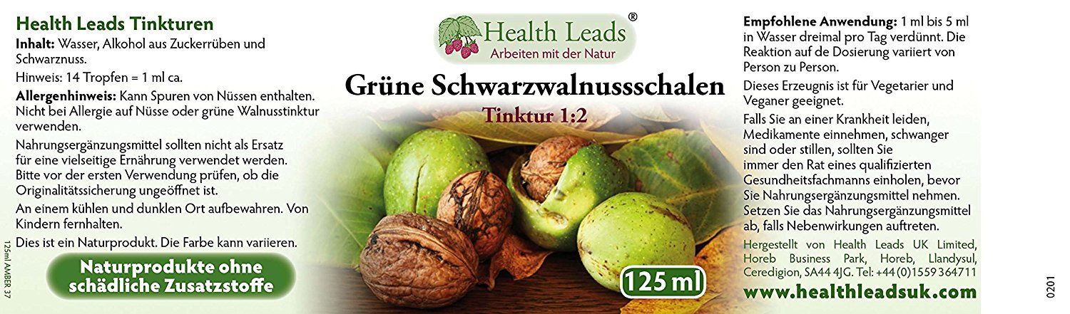 | Beschreibung | Die grüne Schwarznuss-Tinktur wird "grün" genannt, da sie aus den grünen Rümpfen des Schwarznussbaums (Juglans nigra) hergestellt wird. Health Leads Extra Stärke Grün Walnußtinktur wird hergestellt entsprechend dem traditionellen Rezept bei Verwendung von nur der frischen grünen Walnussrümpfe, Alkohol von Zuckerrüben und Wasser. Health Leads Tinktur aus Grün-Walnusschalen wird nur in kleinen Mengen hergestellt und deshalb kann die endgültige Tinktur in Farbe von grün bis tief goldbraun variieren. Grüne Schwarzwallnuss Schale sind von Ürbevölkerungen traditionell als antibakterieller, antiviraler und antipilz Mittel verwendet worden. |