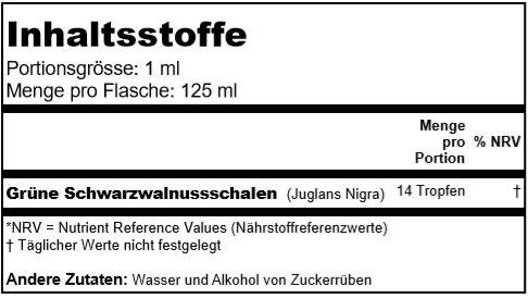 | Inhalt | Wasser, Alkohol aus Zuckerrüben und Schwarznuss (Juglans Nigra). |