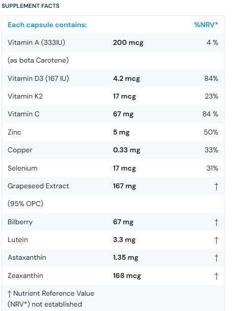 Inhalt Traubenkernextrakt, Hydroxypropylmethylcellulose (Kapsel), Astaxanthinpulver, Ascorbinsäure, Heidelbeerpulver, Luteinpulver, Zinkbisglycinat, Menachinon-7, Selenmethionin, Beta-Carotinpulver, Cholecalciferol, Kupfercitrat, Zeaxanthinpulver.