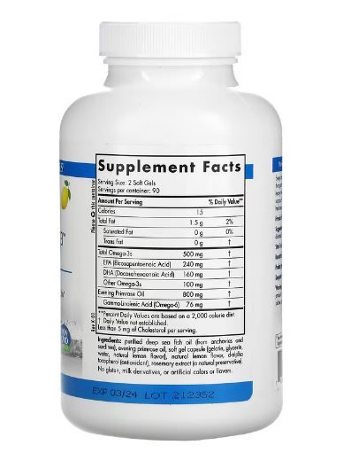 Gereinigtes Hochseefischöl (von Anchovis und Sardinen), Nachtkerzen-Öl, Weichkapsel (Gelatine, Glycerin, Aqua, natürlicher Zitronengeschmack), natürlicher Zitronengeschmack, D-Alpha-Tocopherol (Antioxidans), Rosmarinextrakt (ein natürliches Konservierungsmittel). Ohne Gluten, Milchderivate, oder künstliche Farb- oder Geschmacksstoffe. |