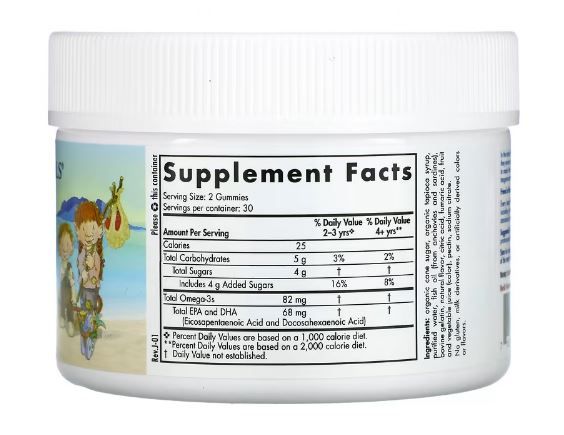 Bio-Zucker, organischer Tapiokasirup, gereinigtes Wasser, Fischöl (aus Sardellen und Sardinen), Schweinegelatine, natürlicher Mandarinengeschmack (in Sonnenblumenöl), Zitronensäure, Pektin, Fumarsäure, Frucht- und Gemüsesaft (Farbe), Natriumcitrat. Kein Gluten, Milchderivate oder künstliche Farben oder Aromen |