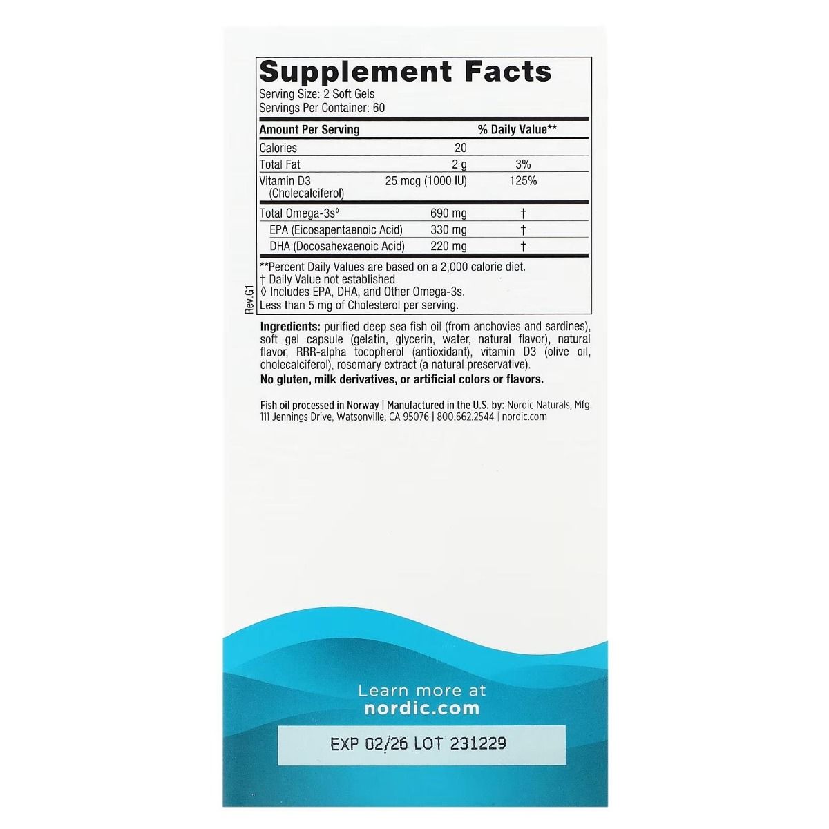 | Ingredients | Purified deep sea fish oil (from anchovies and sardines), soft gel capsule (gelatin, glycerin, water, natural flavor), natural flavor, rrr-alpha tocopherol (antioxidant), vitamin D3 (olive oil, cholecalciferol), rosemary extract (a natural preservative). |