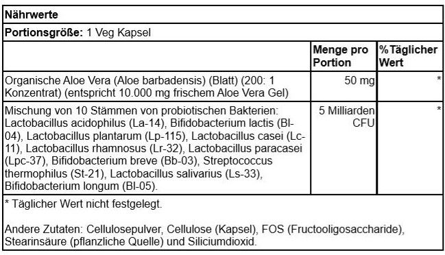 | Beschreibung | Aloe Vera enthält viele Nährstoffe, einschließlich Vitaminen, Mineralien, Enzymen und Aminosäuren. Aloe Vera ist reich an Mucopolysaccharide, auch bekannt als Glycosaminoglycan (GAGs), sind die aktiven Inhaltsstoffe in Aloe Vera. Wissenschaftliche Studie haben erwiesen, dass Aloe die körpereigenen Heilprozesse unterstützen. Eine probiotische 10-Stränge-Mischung hilft zusätzlich zur Aloe Vera als Unterstützung für ein gesundes Verdauungssystem. Die probiotischen Stämme in diesem Produkt wurden durch DNA-Fingerprint-Technologie verifiziert. |