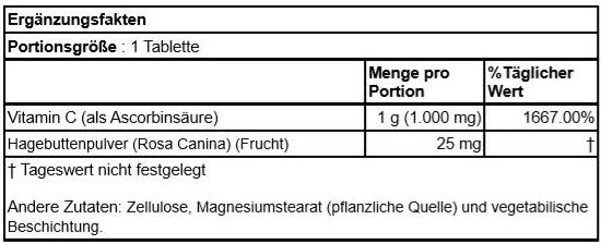 | Beschreibung | Vitamin C ist ein wasserlöslicher Nährstoff, der für seine essentielle Wirkung auf das Immunsystem bekannt ist. Vitamin C ist darüber hinaus für die Produktion von Kollagen (einem Strukturprotein im Bindegewebe) bedeutsam und daher wichtig für Haut-, Knochen- und Gelenkgesundheit. Vitamin C wird auch im Aminosäurestoffwechsel, für die Neurotransmitter-Synthese und die Verwertung zahlreicher Nährstoffe wie Folsäure und Eisen benötigt. Vitamin C ist eine wichtige und sehr wirksame Antioxidantie, und hilft damit dabei die Zellen und Moleküle des Körpers vor Schäden durch freie Radikale und oxidative Moleküle zu schützen, die dürch Stoffwechselreaktionen und Umweltbelastungen entstanden sind. Dieses Produkt wurde speziell entwickelt, um Vitamin C in regelmäßigen Mengen an den Körper freizugeben und enthält Hagebuttenöl als zusätzliche und natürliche Vitamin C-Quelle. |