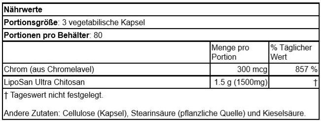 | Beschreibung | Chitosan ist ein Ballaststoff, welcher sich vom Chitin der Schalentiere ableitet. Es kann sich an das Fett und Cholesterin im Verdauungstrakt binden und die Beibehaltung bereits gesunder Cholesterinwerte fördern. Das Chitosan von NOW enthält LipoSan Ultra, eine patentierte konzentrierte Form von Chitosin, die in Laboruntersuchungen bis zu 5-mal mehr Fett als herkömmliches Chitosan gebunden hat. Eine klinische Studie hat gezeigt, dass LipoSan Ultra beim Fördern eines gesunden Körpergewichtes behilflich sein kann. Chrom, ein für den normalen Glucose-Metabolismus essentielles Mineral, wurde zur Vervollständigung in die Rezeptur hinzugefügt. |