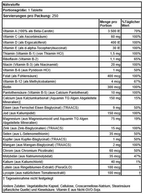 | Beschreibung | Now foods Multivitaminpille hilft damait, einen Mangel an Nährstoffen im täglichen Ernährung zu vermeiden. Sichert tägliche Versorgung mit Mikronährstoffen • Beiträgt zu Vitalität und allgemeine Wohlbefinden • Vitamin A ist notwendig zur Erhaltung normaler Sehkraft • Zink sowie die Vitamine C und D tragen zu einer normalen Funktion des Immunsystems bei • Selen und Vitamin E beitragen zum Schutz der Zellen vor oxidativem Stress • Vitamin B2, B6, B12 und Biotin unterstützen ein normaler Funktion des Nervensystems • Calcium, Kalium und Magnesium tragen zu einer normalen Muskelfunktion bei • Jod ist notwendig für normaler Schilddrüsenfunktion • Magnesium und Vitamin B6 sind wichtig für normaler Energiestoffwechsel. Ein Kapsel pro Tag, enthält auch Lutein und Lycopin. |
