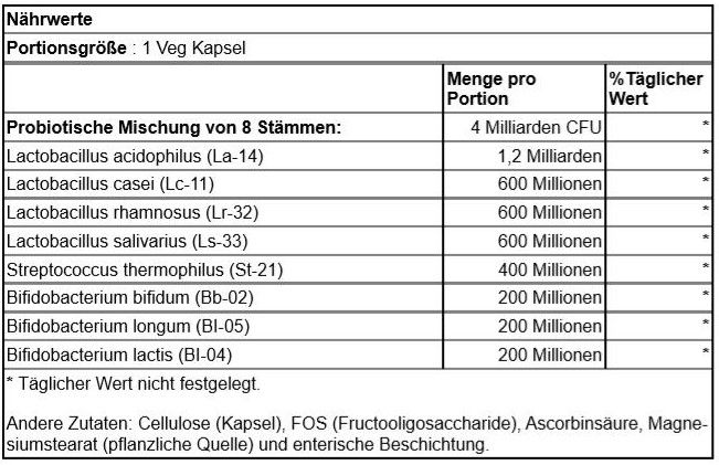 | Inhalt | Cellulose (Kapsel), FOS (Fructooligosaccharide), Ascorbinsäure, Magne-siumstearat (pflanzliche Quelle) und enterische Beschichtung. |