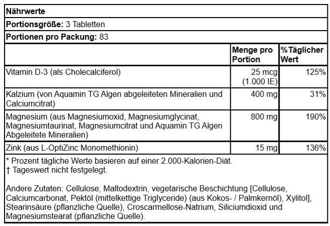 | Beschreibung | Diese Umkehrverhältnis-Formel enthält einen höheren Anteil von Magnesium für alle, die mehr von der Nerven, Muskel und Knochen unterstützenden Wirkung dieses essentiellen Minerals wünschen. Zink und Vitamin D3 sind in diesem Produkt enthalten, da sie für den Knochenstoffwechsel notwendig sind. |