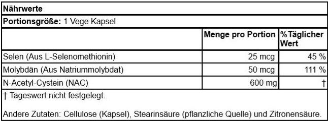 | Beschreibung | N-Acetyl Cystein (NAC) ist eine stabile Form der nicht-essentiellen Aminosäire L-Cystein. Dabei handelt es sich um eine schwefelhaltige Aminosäure, die als Stabilisator für die Bildung von Eiweißstrukturen fungiert und ebenfalls wichtig für die Bildung von Glutathion ist. Molybdän und Selen sind essentielle Spurenelemente, welche die Produktion verschiedener wichtiger Enzyme unterstützen. |