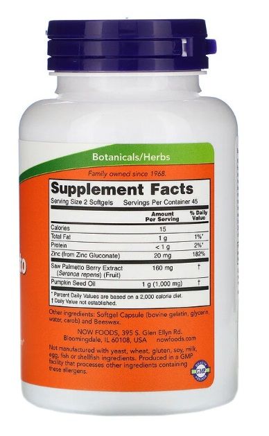 NOW Foods Saw Palmetto Extract mit Kürbiskernöl und Zink, 160 mg, 90 Kapseln