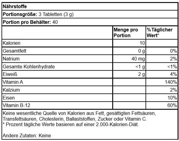 | Inhalt | 100% Bio Spirulina - und sonst nichts. |