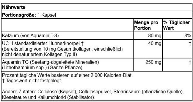 | Beschreibung | Knorpel gehören zu den wichtigsten Bindegeweben des Körpers, und liefert Flexibilität und Unterstützung für die Gelenke. Nichtdenaturiertes Typ-II-Kollagen ist das grundsätzliche Strukturprotein innerhalb von Knorpeln, und ist verantwortlich für die reißfeste Kraft und Stärke des Knorpels. Aus Huhnknorpelserum stammend, ist UC-II eine patentierte Art von nichtdenaturiertem (naturbedingten) Typ-II-Kollagen, das mit dem Immunsystem zusammen arbeitet, um die Gelenksgesundheit zu unterstützen. Klinische Studien an Menschen haben gezeigt, daß nur eine tägliche 40g Kapsel von UC-II, die Gelenksgesundheit, gesunde Gelenksfunktion und -beweglichkeit fördert. |