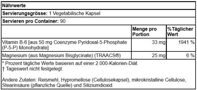 | Beschreibung | Vitamin B-6 (Pyridoxin) wirkt hauptsächlich als Enzymkatalysator in vielen Körperprozessen, einschließlich des Energiestoffwechsels und der Neurotransmitterfunktion. Bevor es für diesen Zweck verwendet werden kann, muss es von der Leber in seine Coenzymform (P-5-P) umgewandelt werden. P-5-P eliminiert diesen Schritt, indem B-6 in seiner umgewandelten Form bereitgestellt wird, was eine größere Bioverfügbarkeit ermöglicht. Magnesium Bisglycinat ist ebenso hoch bioverfügbar und leistet Unterstützung für die Energiestoffwechsel und der Neurotransmitterfunktion. |