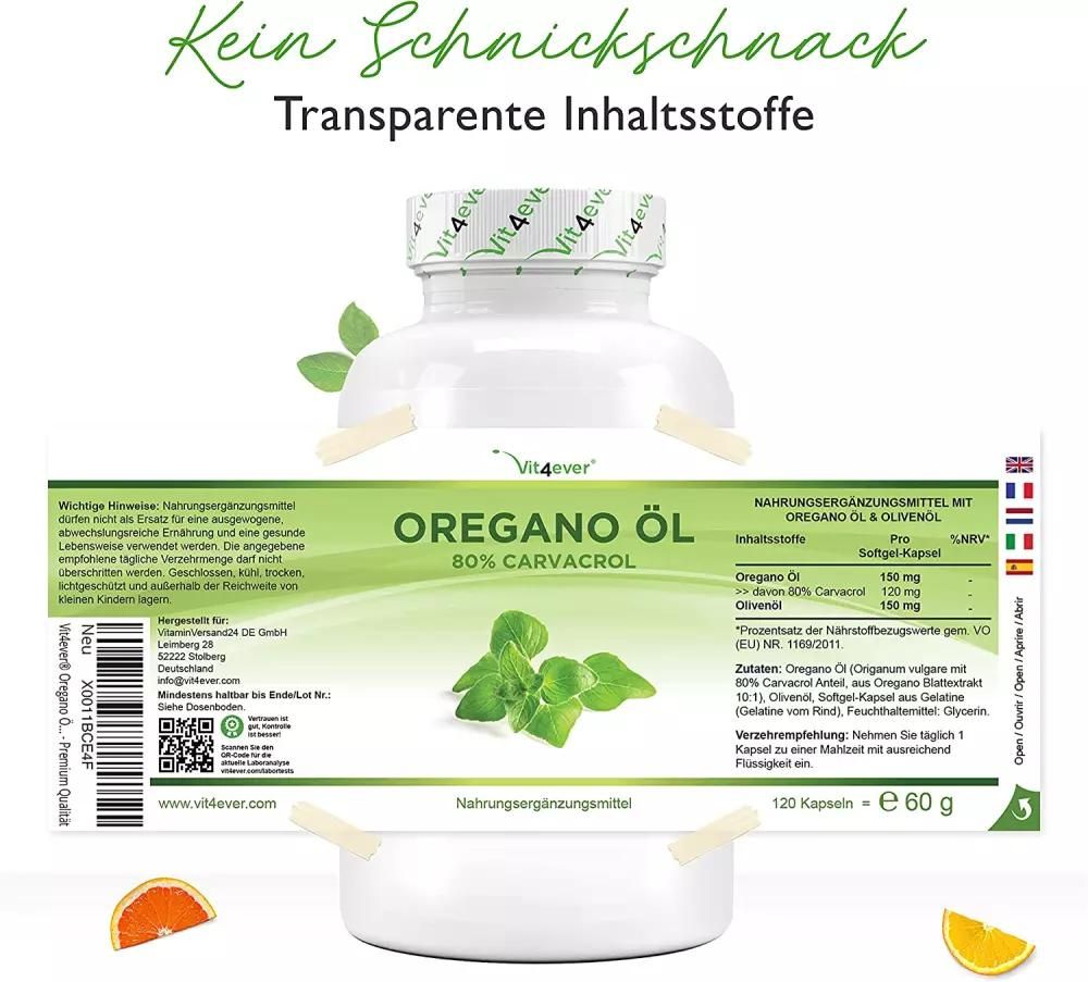 | Inhalt | Oregano Öl (Origanum vulgare, darin enthalten 80% Carvacrol), Olivenöl, Softgel-Kapsel aus Gelatine (Gelatine vom Rind), Feuchthaltemittel: Glycerin. |