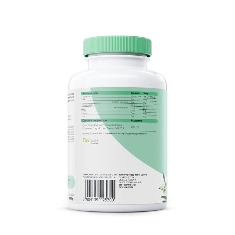 - Das Produkt enthält FlaviPure®, ein hochwertiges Quercetin, gewonnen aus dem Blütenextrakt der Sophora japonica.