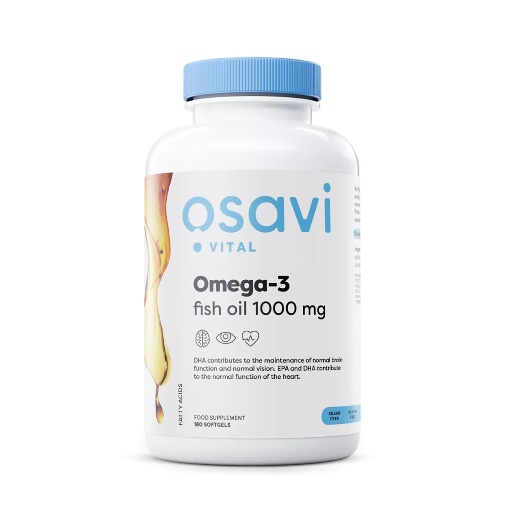 Are you looking for a way to improve brain function? Or do you want to take care of the proper functioning of your heart or eyes? Omega-3 fatty acids can help you take care of your body comprehensively. Reach for fish oil and see for yourself the benefits you can feel and notice. Fish oil is a source of omega-3 fatty acids and refers to two types of fatty acids: eicosapentaenoic acid (EPA) and docosahexaenoic acid (DHA). They are mainly found in fish, and in smaller quantities in other animal products or phytoplankton. They are important for the optimal functioning of individual systems. Omega-3 plays a structural role in the body - it is a component of phospholipids, which form the structures of cell membranes. DHA is found, among others, in the retina and brain. These acids also indirectly affect functions in the cardiovascular, respiratory, endocrine and immune systems [1]. Docosahexaenoic acid (DHA) contributes to the maintenance of optimal brain function and also has an impact on normal vision. It is thought that omega-3 fatty acids may protect against neurodegeneration in the elderly and reduce the risk of cognitive decline [1, 2]. Low intake of these acids may contribute to mood and psychotic disorders, among others [9]. Studies have shown that they are a valuable support for the visual organ in people working at a computer. They have a positive effect on the condition of the eyes, helping to reduce dryness [3]. It has also been shown that omega-3 intake helps the heart and circulatory system to work properly [4]. These acids contribute to lowering triglyceride levels, which may have a role in reducing the risk of cardiovascular disease [5]. Omega-3s are essential fatty acids and must therefore be provided with the diet. They are divided into ALA, i.e. α-linolenic acid (found e.g. in flaxseed oil, soybean oil, rapeseed oil and olive oil), and EPA (eicosapentaenoic acid) and DHA (docosahexaenoic acid), whose sources are fatty fish (e.g. salmon, mackerel, tuna, herring and sardines). EPA and DHA are bioactive forms - in order for the body to utilise ALA, it must be converted to EPA and DHA. However, this conversion is limited [1, 10]. Food supplements containing fish oil can be helpful in taking care of the body's optimal performance. The Osavi product is a specially formulated omega-3 fatty acid concentrate derived from the oil of pelagic fish (anchovies) from sustainable fisheries in the Pacific Ocean. The supplement is produced and tested according to the GOED (World EPA and DHA Omega-3 Organisation) monograph, and the oil used in its production is certified Friend of the Sea. There are 1,000 mg of purified fish oil per capsule and 2,000 mg of oil in the recommended daily serving (2 capsules), including min. 700 mg of omega-3 fatty acids.The product has a high content of EPA (min. 360 mg) and DHA (min. 240 mg). Omega-3 fish oil 1000 mg is a supplement in soft capsule form providing the essential fatty acids EPA and DHA. |