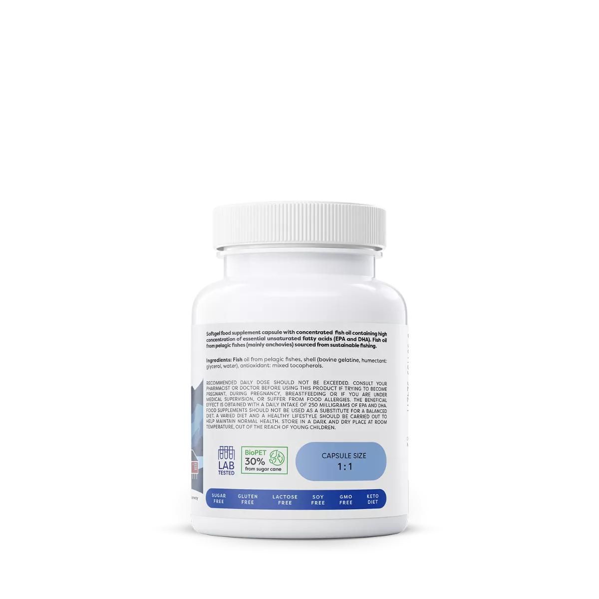 Softgel food supplement capsule with concentrated fish oil containing high concentration of essential unsaturated fatty acids (EPA and DHA). Fish oil from pelagic fishes (mainly anchovies) sourced from sustainable fishing. Want to support your body on many levels? Super Strong Omega-3 capsules will take care of your brain, heart, eyesight and proper immunity, but that's not all! The omega-3 fatty acids contained significantly support the functions of many systems and organs so that you can enjoy good health every day. Pelagic fish oil is an excellent source of omega-3 unsaturated fatty acids, which include eicosapentaenoic acid (EPA) and docosahexaenoic acid (DHA). The human body is unable to produce them, so we should supply them with our diet. Good sources of EPA and DHA include products such as salmon, trout, cod, herring, mackerel and sardines, but if you do not consume fish twice a week, it is worth considering providing the acids in the form of fish oil. DHA acid is part of the structure of the brain, the phospholipids of nerve cell membranes and the retina of the eye. The phospholipids of cell membranes that contain DHA help to maintain proper nerve transmission, which is important, among other things, for maintaining good mood, physical condition or mobilising the body in stressful situations [1]. EPA and DHA acids contribute to the proper functioning of the cardiovascular system through positive effects on triglyceride levels, blood pressure, platelet aggregation and endothelial function [2]. In addition, they counteract the effects of oxidative stress such as cellular and tissue damage [3]. A good example of this effect is the effect of DHA acid on vision, which, as it turns out, not only counteracts damage to the eyes, but also plays an important role in normal, clear vision [4]. Insufficient intake of omega-3 fatty acids has been linked to a higher susceptibility to develop allergies [5]. Metabolites of EPA and DHA acids (resolvins, protectins) are involved in reducing inflammation by inhibiting the excessive immune response and influencing the reduction of damage to cellular structures [6]. Thus, EPA and DHA play an important role in maintaining normal immune function throughout life. In fact, these acids are important for our body from the prenatal period onwards. They support the normal course of pregnancy, the maturation of the fetal nervous system and the development of cognitive, behavioural, speech and visual functions [6]. EPA and DHA acids have a beneficial effect on the intestinal microbiome, which can benefit digestive function, maintenance of normal body weight, immunity and even skin condition [7]. It is worth noting that omega-3 fatty acids support neuronal function and cell membrane integrity in the brain, which is important for maintaining psychological health and brain function. If their intake is insufficient, this may contribute to the development of neurodegenerative disorders, especially during ageing, and may also result in mood deterioration [8]. Recent reports emphasise the importance of omega-3 fatty acid intake for fertility preservation. Fertility support supplementation may benefit women who are overweight and obese, as well as women trying to get pregnant naturally by increasing the likelihood of conception [9,10]. Omega-3 fatty acids can also support male fertility by improving sperm quality and sperm motility [11,12]. Super Strong Omega-3 is a dietary supplement in the form of a soft capsule containing a specially formulated concentrate of omega-3 fatty acids obtained from the oil of sustainably caught pelagic fish. The oil is produced using molecular distillation and formulated in accordance with the GOED (World Organisation EPA and DHA Omega-3) monograph. It contains a high concentration of essential fatty acids (EPA and DHA). One capsule per day provides 1,000 mg of fish oil, including as much as 500 mg of EPA and 250 mg of DHA. This high content of omega-3 fatty acids allows you to take comprehensive care of your body. Why would someone benefit from supplementing with Super Strong Omega 3? |