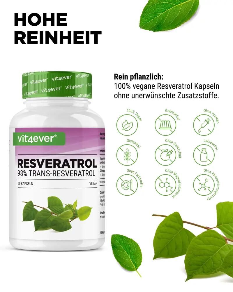 - 98 % Trans-Resveratrol, aus natürlichem japanischem Knöterich-Extrakt.