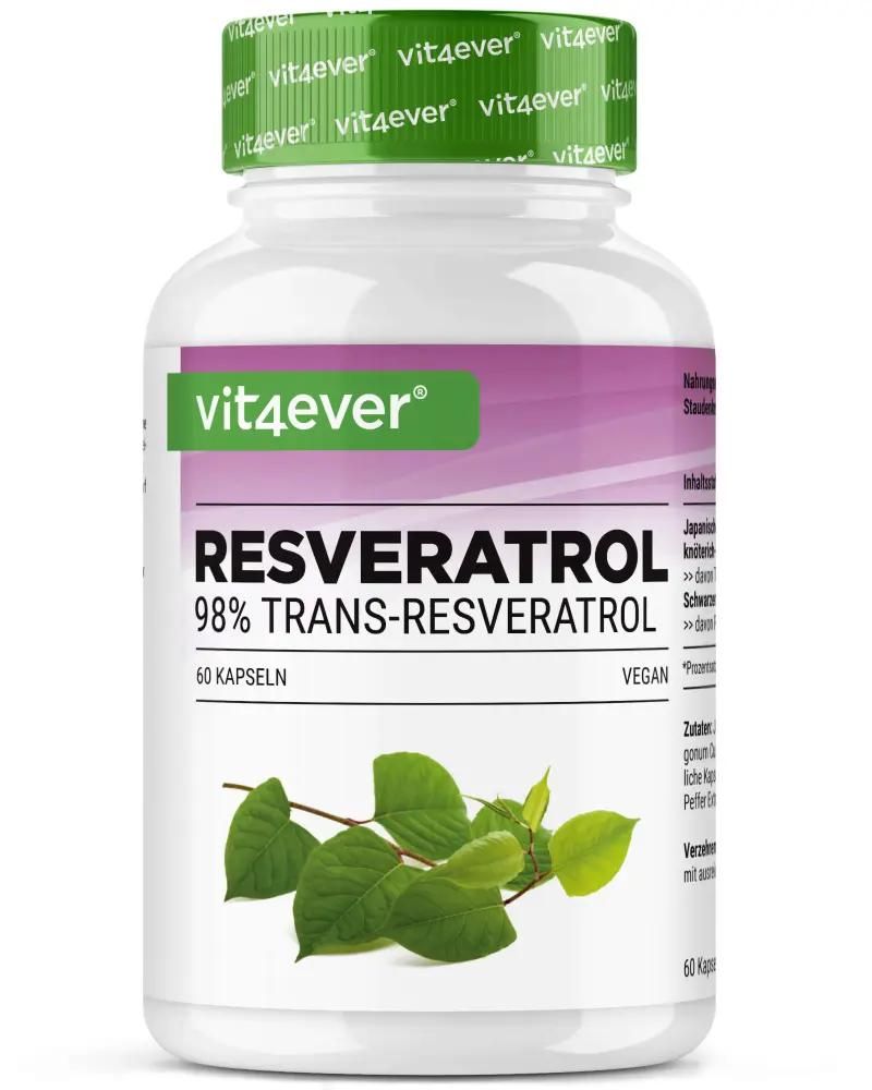 Vorkommen von Resveratrol:Resveratrol in größeren Mengen kommt vor allem vor in Himbeeren, Erdnüssen, Maulbeeren, Trauben (Weintrauben), Teeblättern und dem japanischen Staudenknöterich vor. Die höchste Bekanntheit erlangte Resveratrol, da es durch die Verarbeitung von Trauben auch im Rotwein zu finden ist. An dieser Stelle sollte allerdings erwähnt werden, dass der Resveratrol-Gehalt in Rotwein nicht so hoch wie gewünscht ausfällt. Vit4ever premium QualitätVit4ever Resveratrol Intenso Kapseln, überzeugen mit einem 98%igen Trans-Resveratrol Gehalt = 500 mg, welcher aus 510 mg reinem und hochwertigem japanischen Staudenknöterich Extrakt gewonnen wurde. Optimiert haben wir das Ganze noch durch die Zugabe von Schwarzem Pfefferextrakt, welches 9,5 mg reinem Piperin entspricht, um ein Maximum an Resorption zu schaffen. Resveratrol Intenso Kapseln sind 100% vegan und frei von schädlichen Zusatzsoffen. |