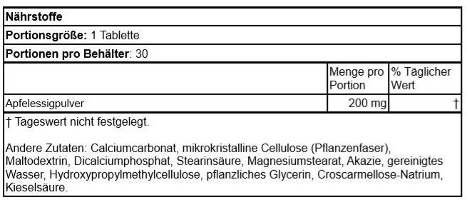 | Beschreibung | Swansons Apfelessigtabletten bringen diese klassische Diäthilfe mit der stärksten Version bisher. Jede Kapsel enthält 200 mg Apfelessig, damit Sie sich beim Erreichen Ihrer Gewichtsziele optimal fühlen. Aber Sie müssen kein Diätetiker sein, um von Apfelessig und seinen einzigartigen Systemspülungsfunktionen zu profitieren. |