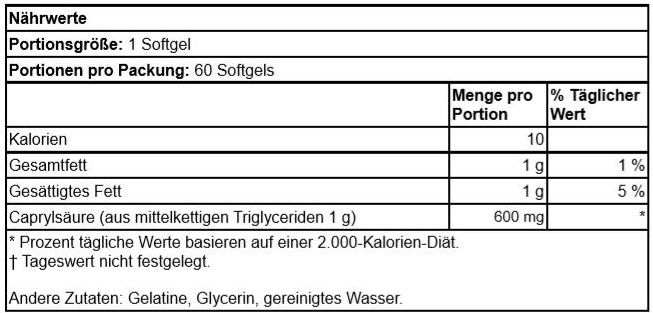 | Beschreibung | Caprylsäure wurde zuerst von Dr. William Crook, dem Autor des berühmten Buches über die innere Gesundheit "The Yeast Connection" ("Die Hefe-Verbindung"), als Nahrungsergänzungsmittel bekannt gemacht. Heutzutage wird es häufig als Begleiter zu anderen wirksamen Nahrungsergänzungsmitteln wie Acidophilus und FOS für ein gesundes mikrobielles Gleichgewicht verwendet. Auch viele Sportlern verwenden es, weil es schnelle Energie gibt. Caprylsäure ist ein mittelkettiges Triglycerid (MCT) ), eine Art Lipid, das nicht im Darm, sondern in der Leber wie Kohlenhydrate abgebaut wird. Sie liefern also schnelle Energie - mehr als doppelt so viel wie Glukose. |