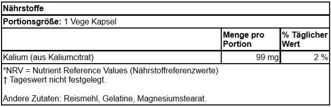 | Warnhinweise | Nur für Erwachsene. Falls Sie an einer Krankheit leiden, Medikamente einnehmen, schwanger sind oder stillen, sollten Sie immer den Rat eines qualifizierten Gesundheitsfachmanns einholen, bevor Sie Nahrungsergänzungsmitteln nehmen. Konsultieren Sie einen Arzt, wenn Sie Medikamente einnehmen (besonders solche, die die Nierenfunktion oder den Kaliumspiegel im Blut beeinflussen können) oder an einer Erkrankung leiden (insbesondere Herz- und Nierenerkrankungen oder Diabetes). |