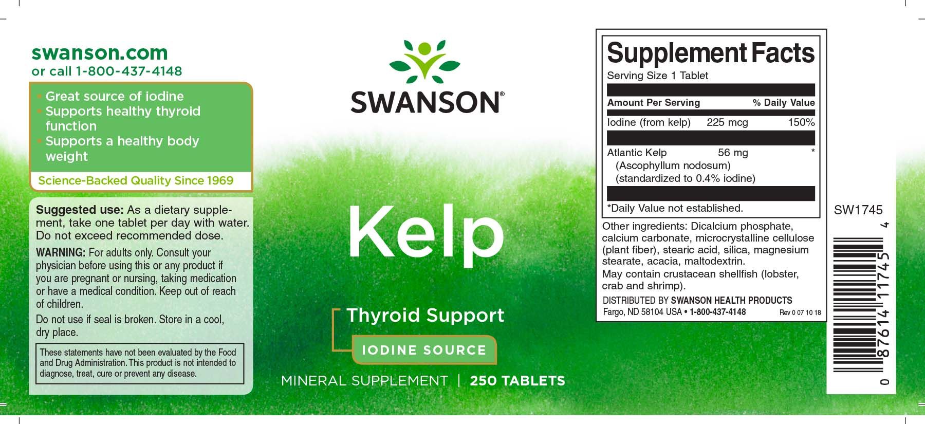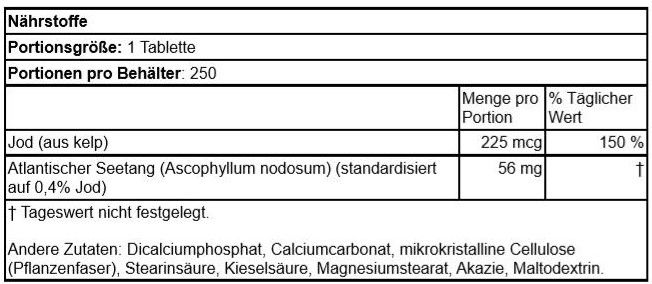 | Beschreibung | Swanson Kelp ist eine einzigartige Formel, die die Gesundheit der Schilddrüse fördert. Diese Meerespflanze ist reich an Nährstoffen und enthält Jod, ein essentielles Mineral, das für eine gesunde Schilddrüsenfunktion bekannt ist. Jede Kelp-Tablette enthält 225 µg Jod. |