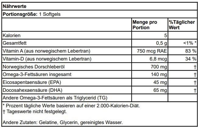| Beschreibung | Swanson Doppelte-Stärke Lebertran ist ein Schritt über den traditionellen Lebertran. Diese hochwirksame Formel enthält die Vitamine A und D zur Förderung starker Knochen, gesunder Augen, Haut und Immunfunktion. Jedes hoch-bioverfügbarer Softgel liefert 2.500 IE Vitamin A und 270 IE Vitamin D für eine effektive tägliche Supplementierung. |