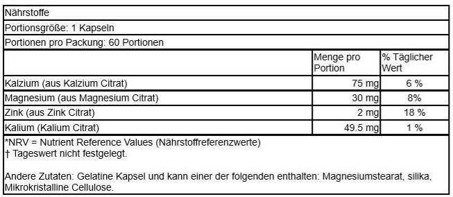 | Inhalt | Gelatine Kapsel und kann einer der folgenden enthalten: Magnesiumstearat, silika, Mikrokristalline Cellulose. |